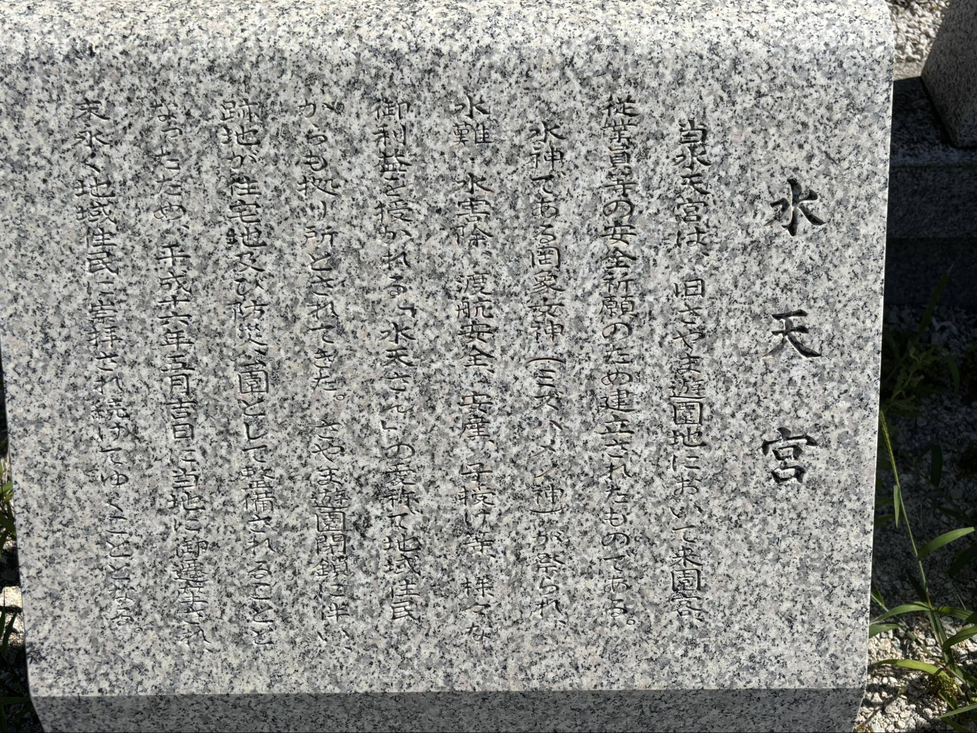 狭山池水天宮の由来については、石板に刻まれていました。かつて狭山池のほとりに存在したさやま池遊園地への来園客や従業員等の安全祈願のために建立されたそうで、明確な建立の時期は不明とのこと。