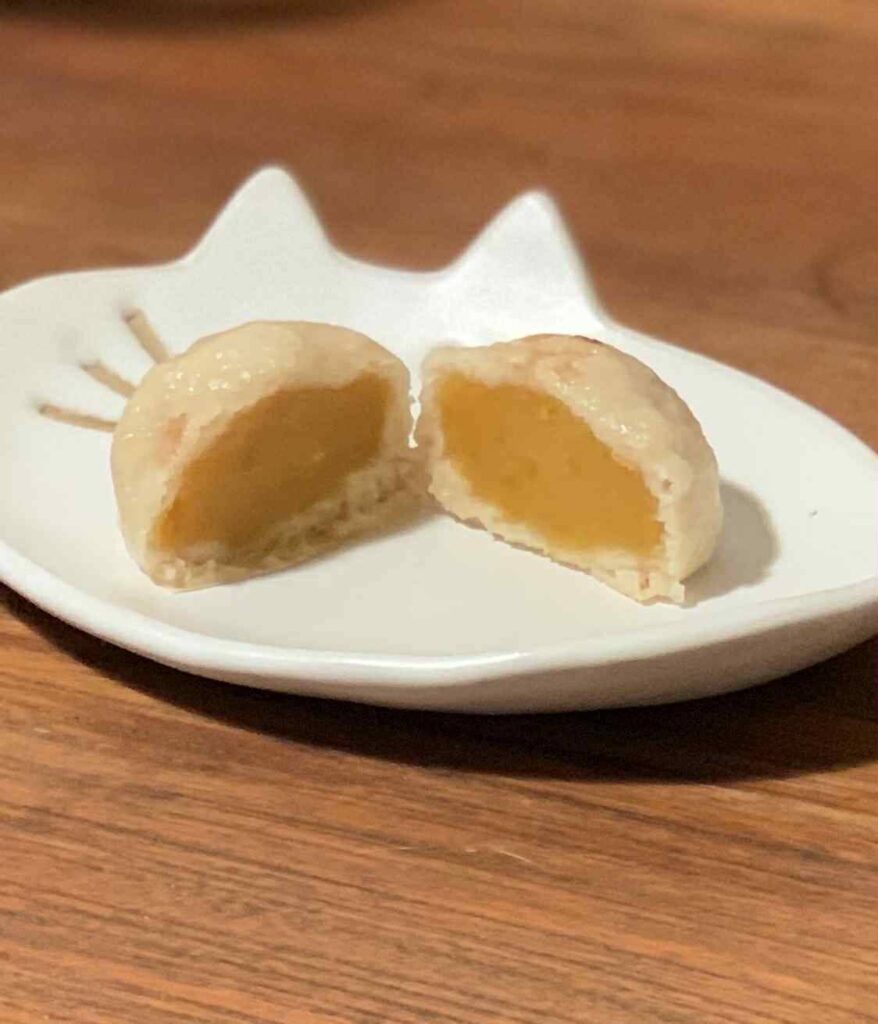 にゃんぢぅのお饅頭の中身はこのようになっています。これはにゃんぢう9月限定の「かぼちゃあん」で、自然栽培かぼちゃ使用しているそうです。