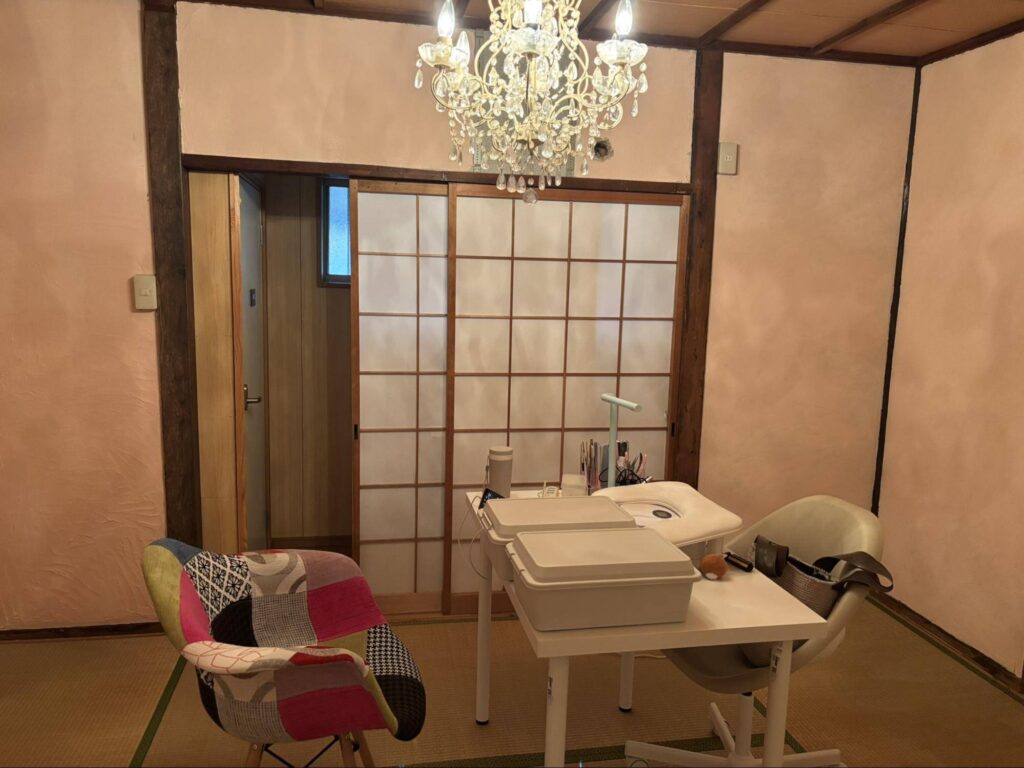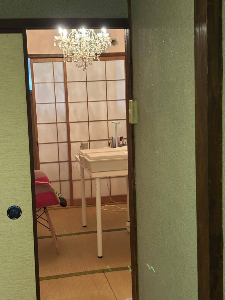 こちらが施術室です、和室の中に洋のシャンデリアが吊るされているだけで随分と雰囲気が異なりますね。ネイリストは、もちねこさんの娘さん(小もちねこさん)で、完全予約制のネイルサロンを行っています。