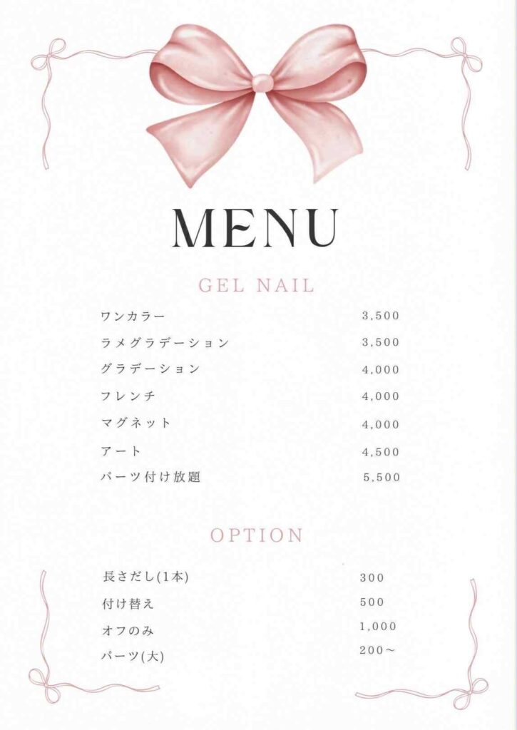 こちらがメニューです。GEL NAILをメインにオプションにも対応しているそうです。