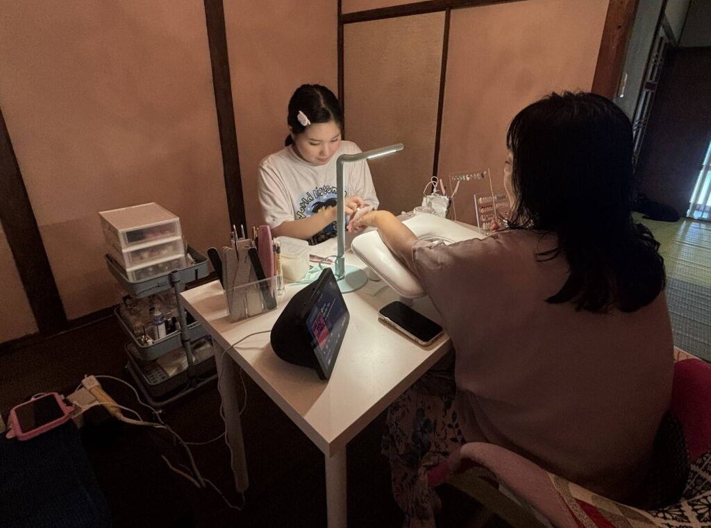 新しい店舗では、にゃんぢうの販売以外の新しいサービスが始まりました。それはネイルサロンをオープンしたのです。障子の奥に施術室があります。