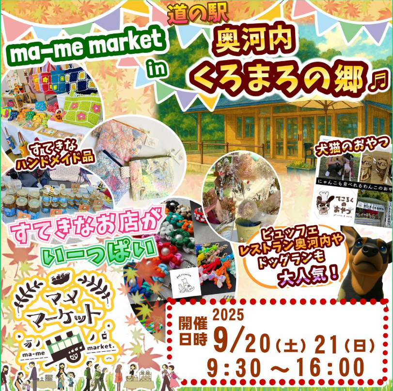 道の駅奥河内くろまろの郷で本日9月20日土曜日と明日21日の2日間、恒例のma-me Marketが行われます。