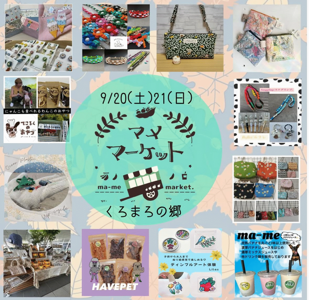 両日とも9:30~16:00までで、ハンドメイド作品を販売するお店が数多く並びます。また犬猫のおやつも販売します。人気の常設のドッグランもあるので、ワンちゃん連れやファミリーなど気になる方はくろまろの郷に遊びに行ってみてはいかがでしょう。