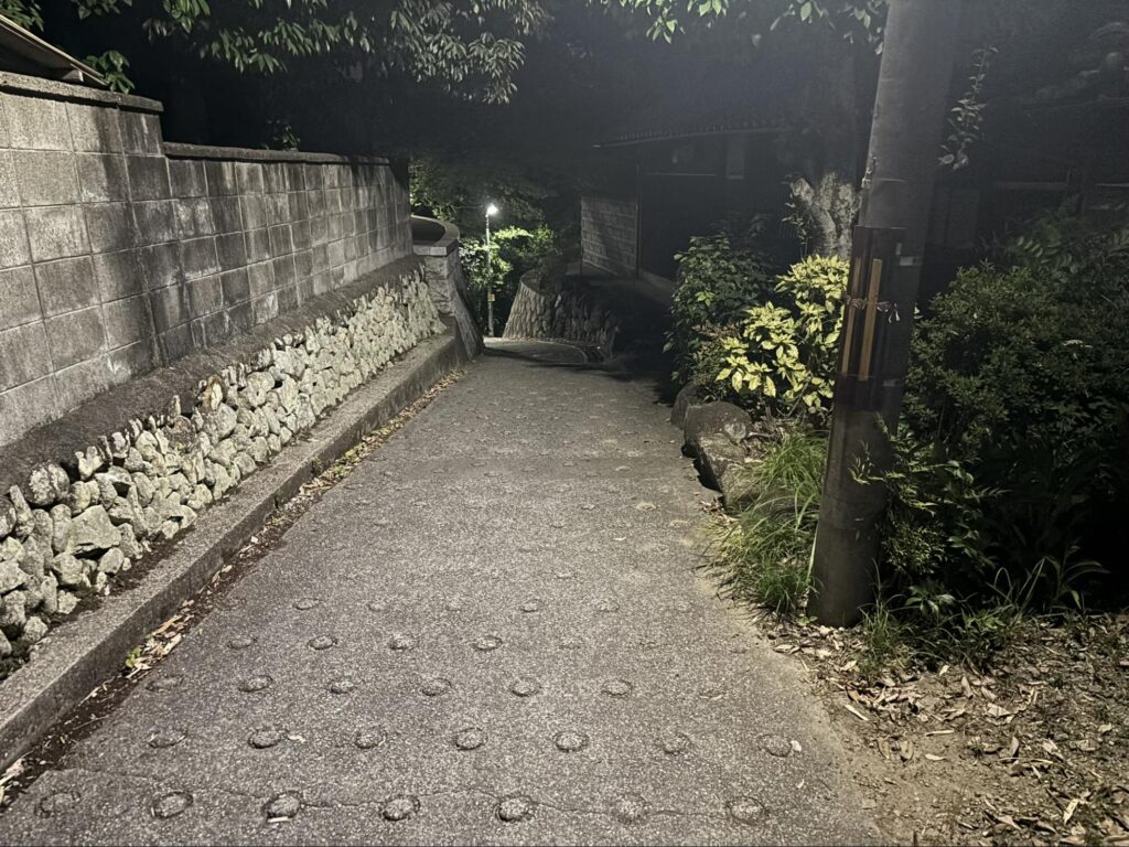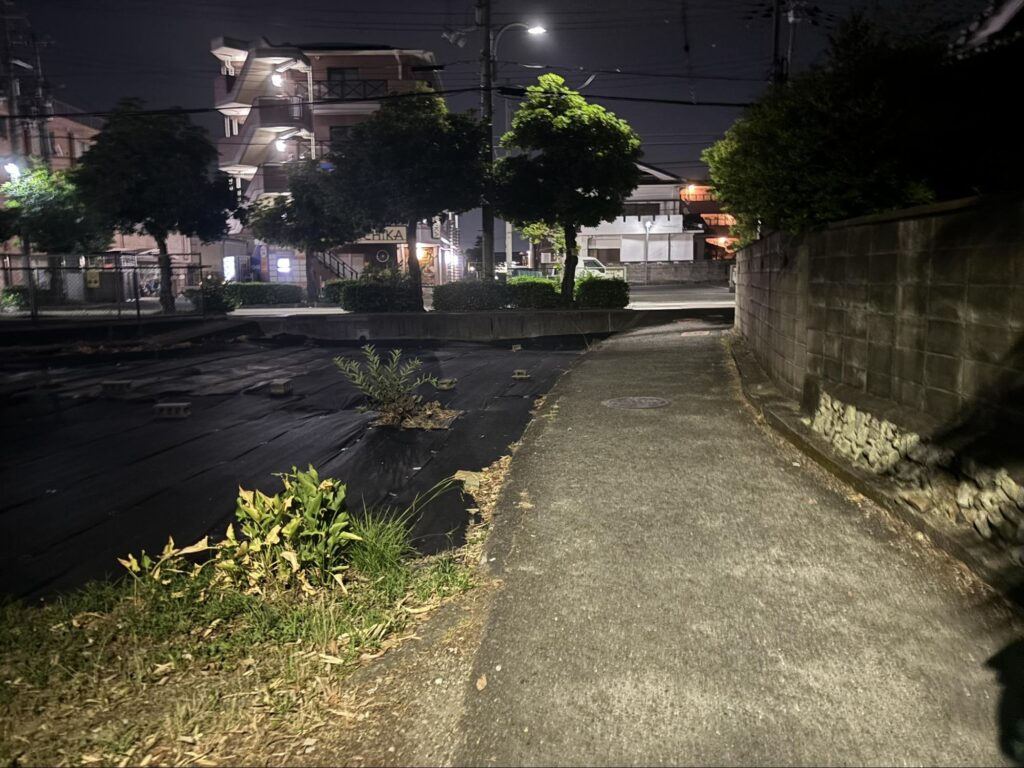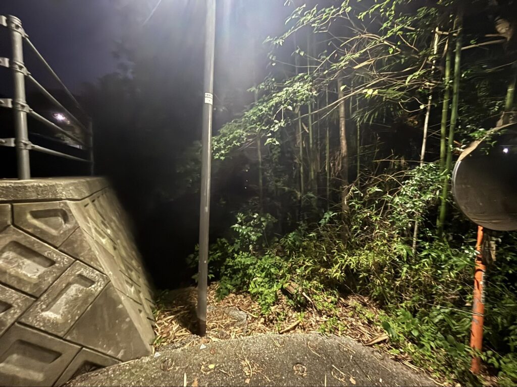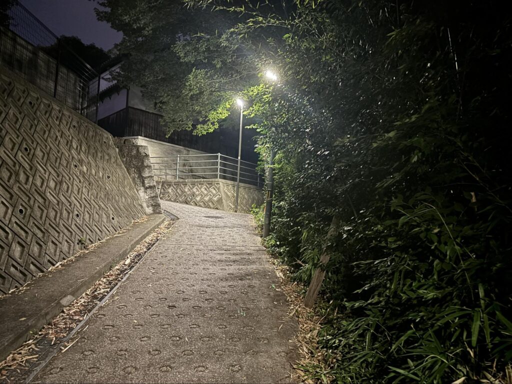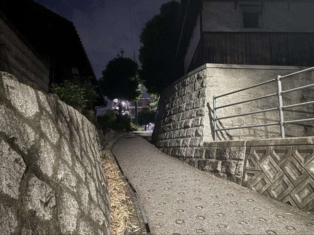 夜間ですが、「シロノサカ」と呼ばれるこの道は金剛駅に向かう近道なので歩いてみました。南河内における中世城館の調査のうち、「狭山神社遺跡の土塁と半田城」によると、あくまで「可能性のひとつ」として、狭山神社にある二重の土塁を河内半田城の城郭として使用されたと推定しているそうです。