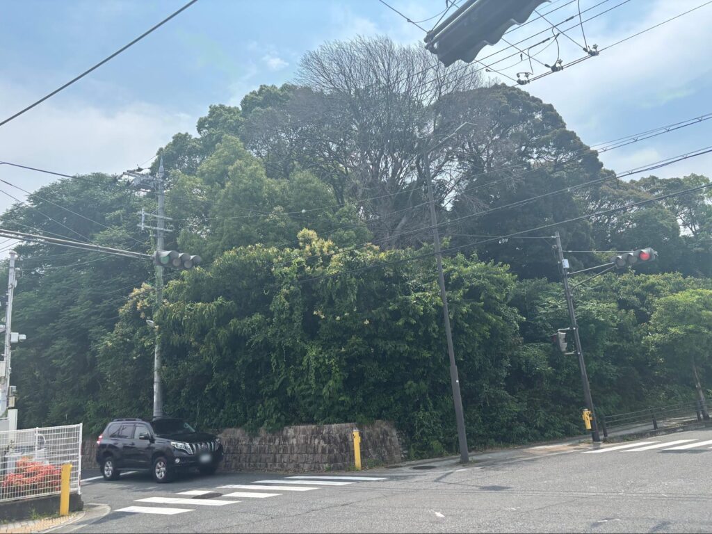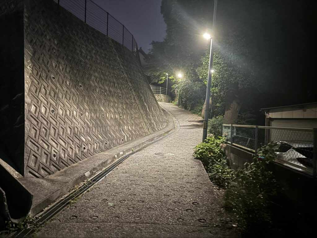 シロノサカの先は下りではなく平坦な道で、金剛駅の近くに行けます。このあたりに昔は谷があったそうですが、今は埋め立てられて車が通れる道になっています。