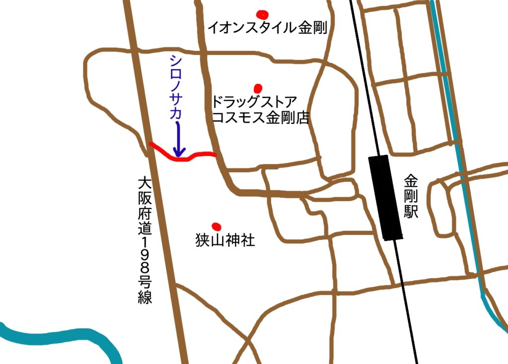 大阪府教育委員会の資料によれば、狭山神社の西側を南北に続いている大阪府道198号「河内長野美原線」で狭山神社の北側から南海金剛駅に抜ける坂道があるのですが、これを「シロノサカ」と資料では呼んでおり、河内半田城に続く道と推定しているとのこと。