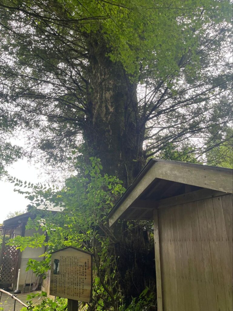 またこちらは岩湧寺のカヤの木で、樹齢が400年ほど。高さが20メートルあり、幹回りが5.97メートルあるそうで、この木も河内長野市指定文化財です。