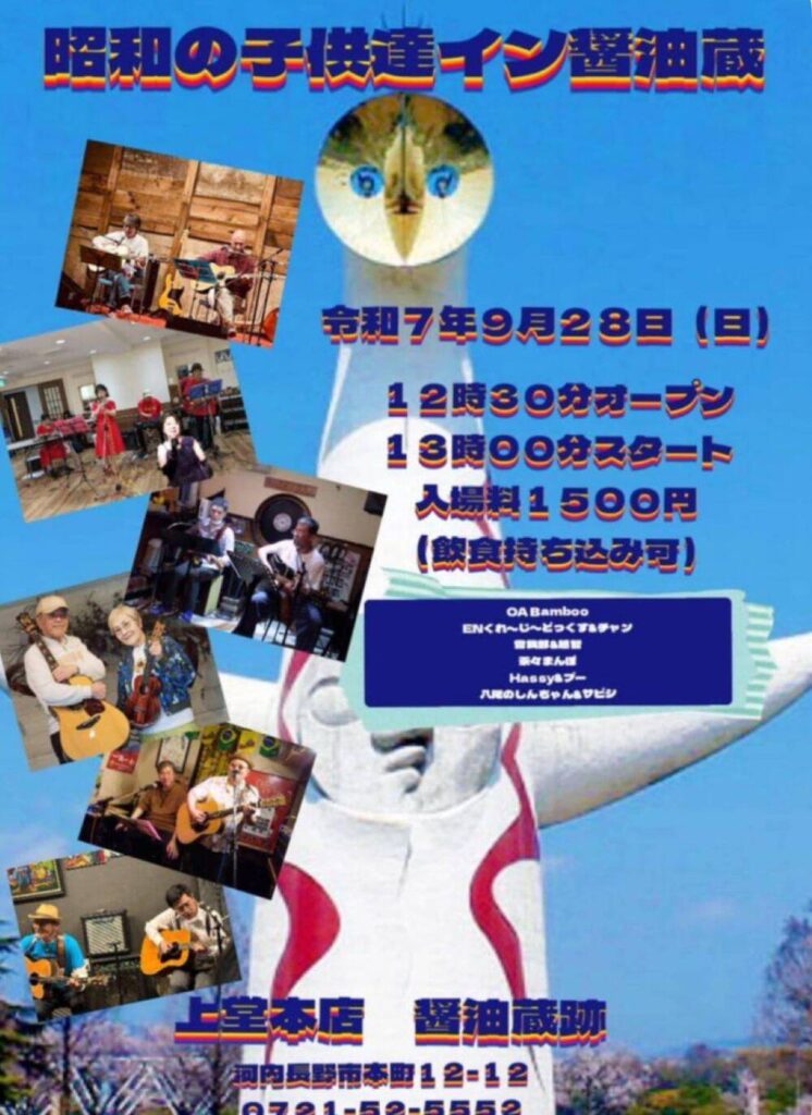今年は万博ウィークということもありいつもの年と違ってイレギュラーな感じでしたが、その万博もいよいよ閉幕の時が近づいてきました。河内長野駅前長野商店街の中にある上堂醤油蔵でも万博にちなんだイベントで、前回の1970年の万博の頃は子供だった、現在の大人たちが演奏するイベントが行われます。