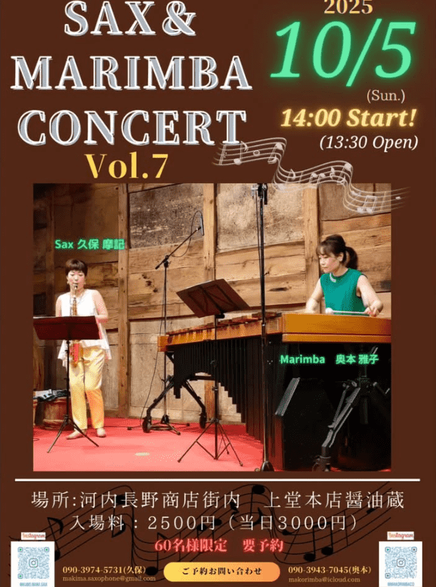 - 10月5日 14:00~ SAX&MARIMBA CONCERT Vol.7 2,500円(当日3,000円)定員60名要予約