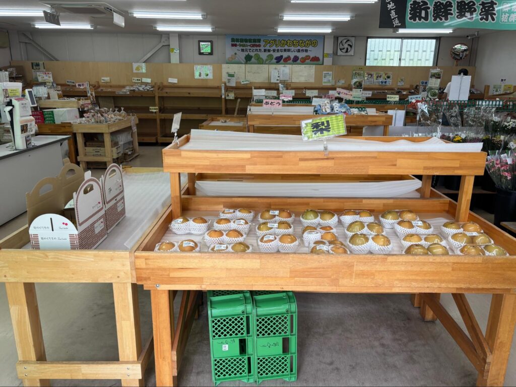 小山田の桃を筆頭に、季節のフルーツも多く並ぶ売り場、訪問時には画像のように梨を販売しています。梨のほかにいちじくやぶどうなど旬の果物が並びます。