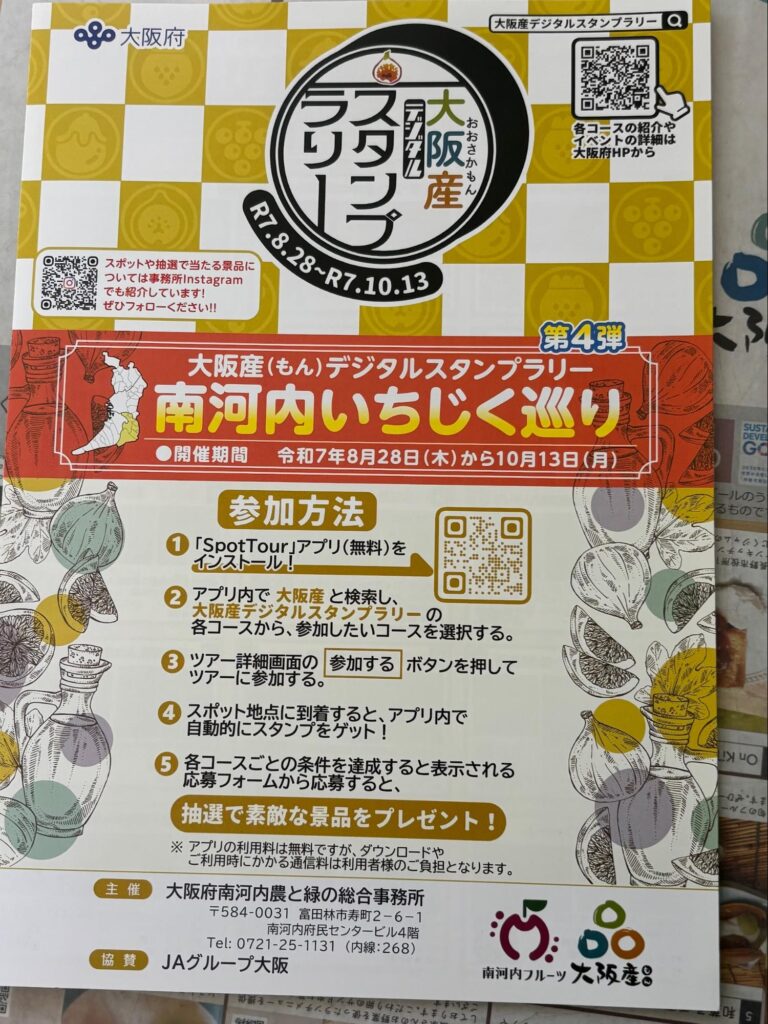 そんなアグリかわちながので大阪産(もん)デジタルスタンプラリー南河内いちじく巡りのチラシを見つけたので、その場でさっそく挑戦しました。コースごとに設定された以下の条件を達成すると応募ができて、抽選で素敵な景品がいただけます。10月13日が申し込み締め切りです。