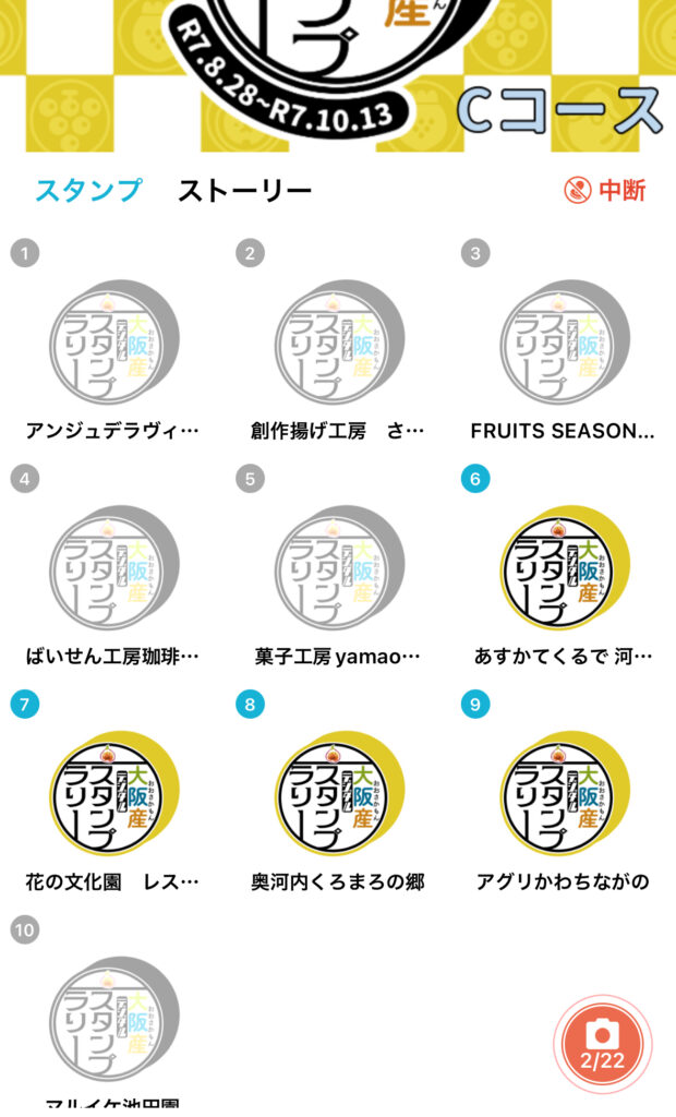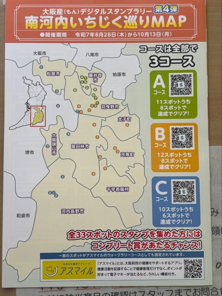 最後に残りのCコースの拠点を紹介しましょう。高向で3か所集めて残りはアグリかわちながのと2拠点、あるいは3拠点行ってスタンプを手に入れれば10月13日に十分間に合います。