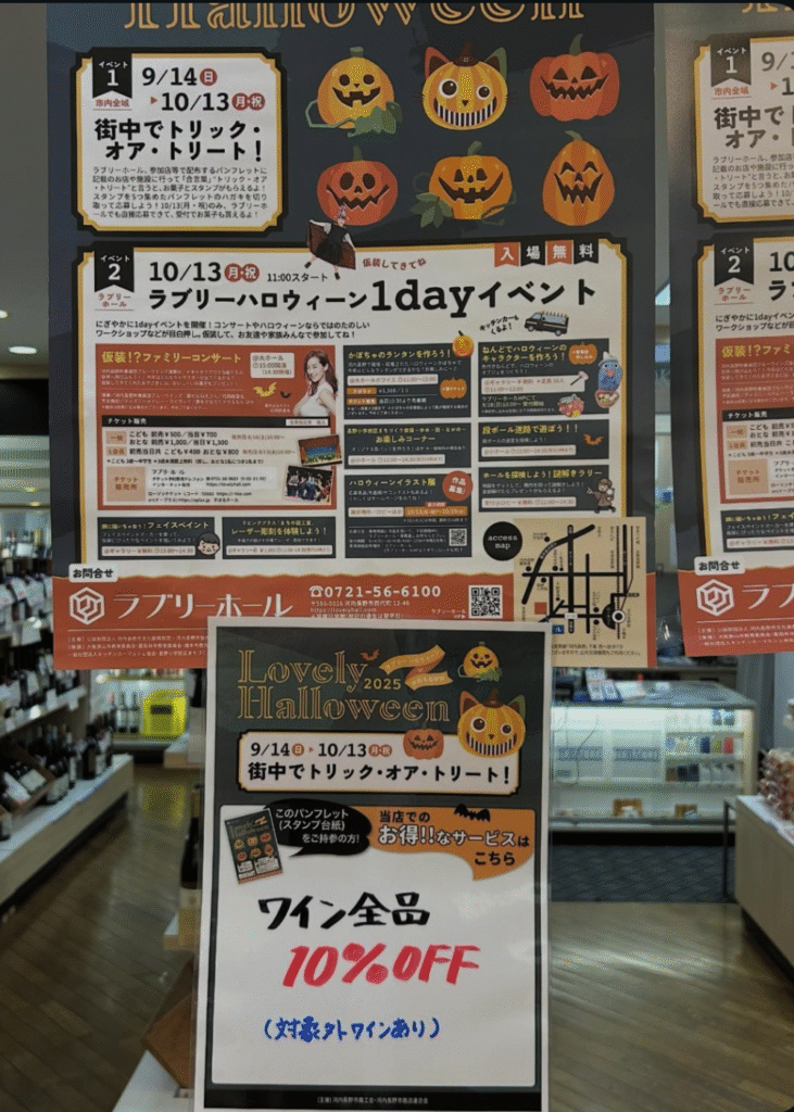 ラブリーハロウィン2025は原則的に中学生までのお子さんが対象となっているイベントですが、酒蔵にしおかさんでは、大人も特典が得られます。パンフレットを持参すると、驚いたことにワインが全品10%OFFです!普段なかなか手が出ないにしおかさんの高級ワインを少しお得に手にいれられるまたとない好機です。