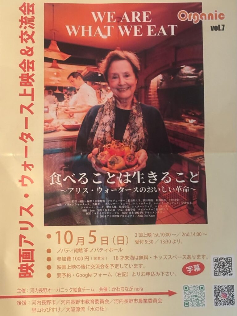 かわちながnoraは河内長野オーガニック給食チームが母体となっているのですが、そのオーガニック給食チームが10月5日にノバティホールで映画上映会と交流会を開催します。