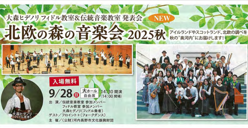 【河内長野市】入場無料!9月28日にラブリーホール大ホールで大森ヒデノリフィドル教室&伝統音楽発表会2025秋が行われます(オリジナル)