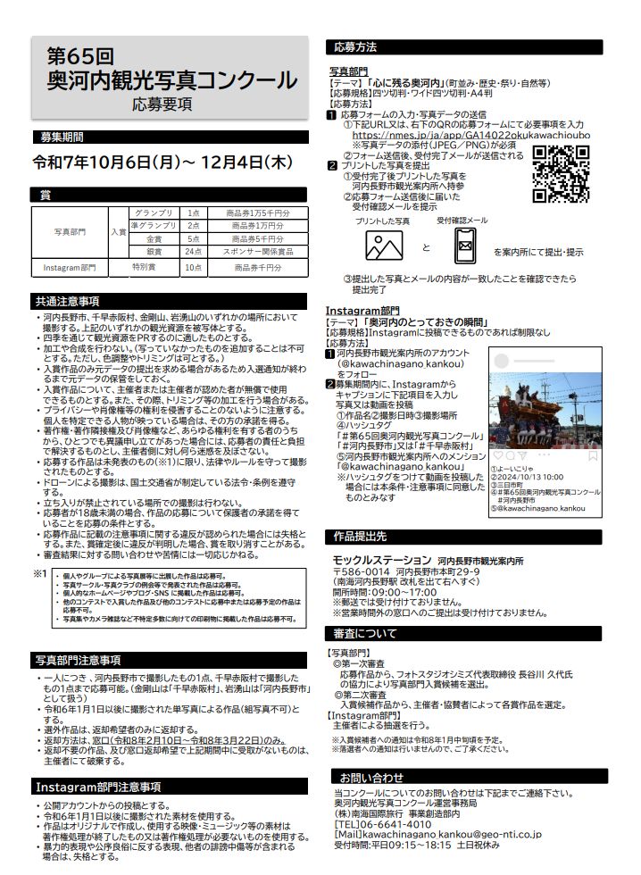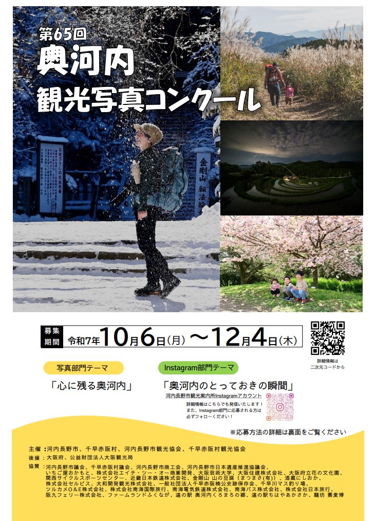 今年で65回目となる奥河内観光写真コンクールが10月6日から12月4日の間募集しています。写真部門とInstagram部門があり、写真部門はグランプリ、準グランプリ、金賞、銀賞、Instagram部門は特別賞が選ばれ、副賞として商品券やスポンサー関係商品が与えられます。