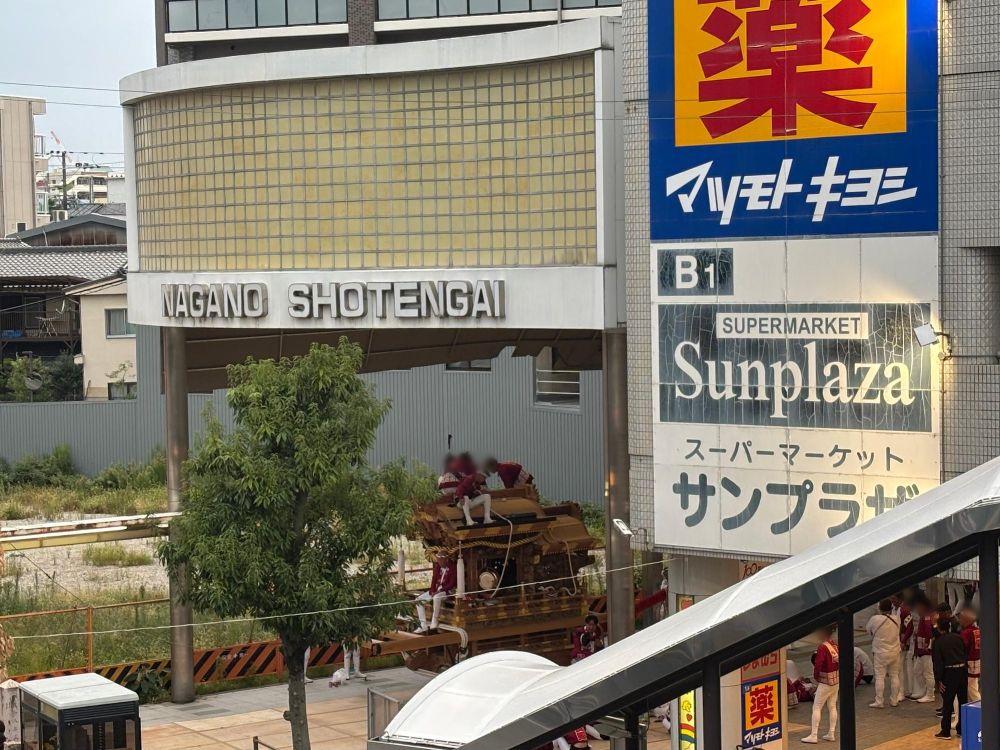 陸橋に上がってみると、地元長野の地車だけ、長野商店街の入り口で待機していました。休憩中のようです。