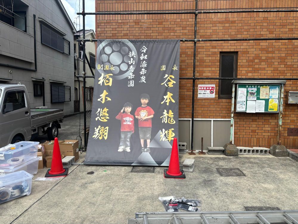 また意外なところにも幟が並んでいます。これは野作の幟のようです。富田林などほかの地区では試験曳は祭りの前日の金曜日などで行われることが多い印象ですが、河内長野の地車はどこの地区も祭り本番の2週間前に試験曳が行われて祭りムードを盛り上げ、2週間後のスポーツの日がらみの連休に秋祭りとして地車といろんな祭りや神事が行われます。