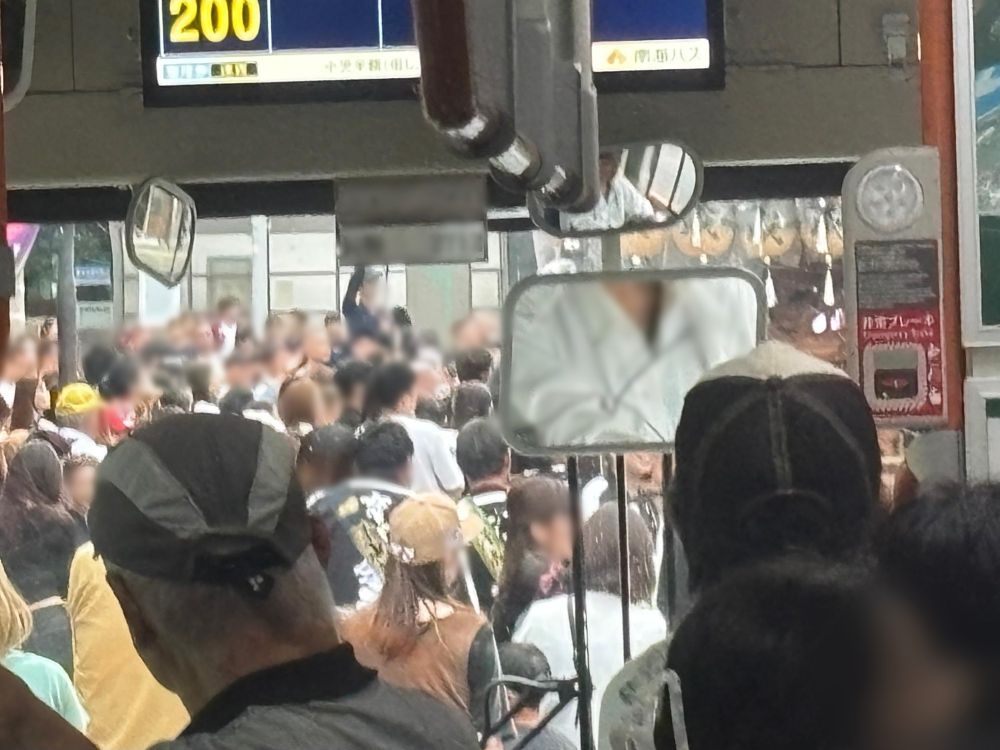 そしてバスの目の前が人であふれかえっています。これには遊び疲れていた乗客の方々の多くも驚いていました。