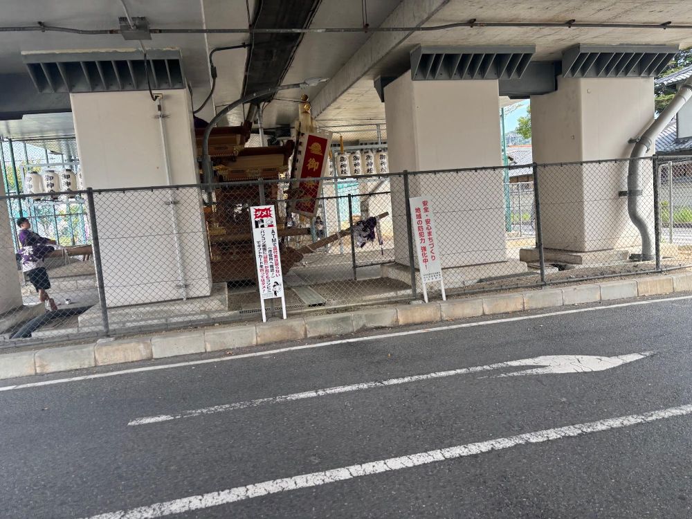 意外なところにも地車がいます。原の地車は大阪外環状線の高架の下にある原地区町会ちびっこ広場で待機していました。
