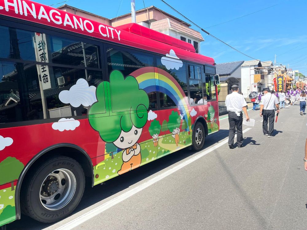(だんじりと一緒に行進するモックルコミュニティバス)