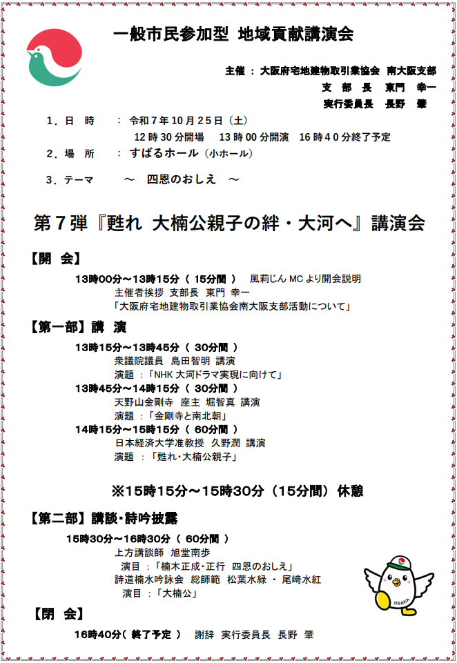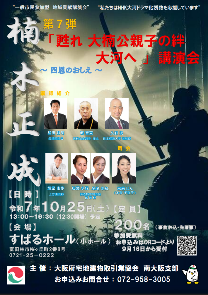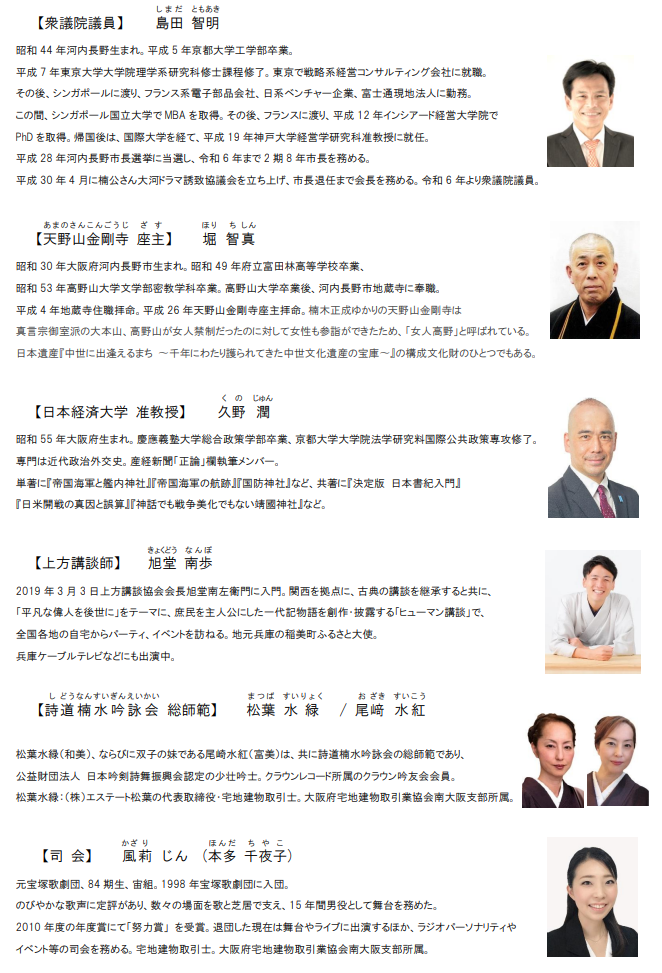 今回で7弾目となる「甦れ 大楠公親子の絆 大河へ」講演会が10月25日土曜日にすばるホールの小ホールで定員200名で行われ、参加費は無料です。出演者は以下のように各分野の専門家が集まって行われます。司会は元宝塚歌劇団84期生宙組の風莉じん (本多千夜子)さんです。