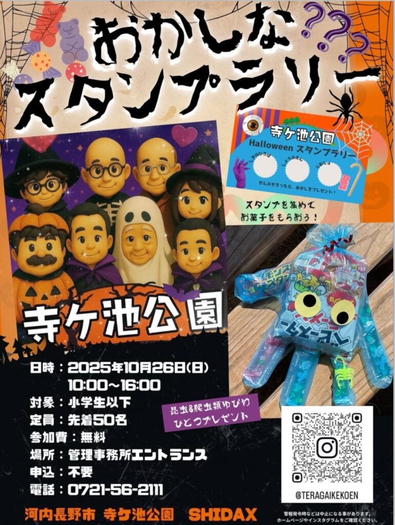 翌週も面白いイベントがあります。寺ヶ池公園ではハロウィンスタンプラリーが行われます。対象は小学生以下、参加すると昆虫&爬虫類指輪がひとつプレゼントされます。先着50名までが定員ですが、事前申し込みは不要、当日直接現地(管理事務所エントランス)に行きましょう。また参加費は無料です。
