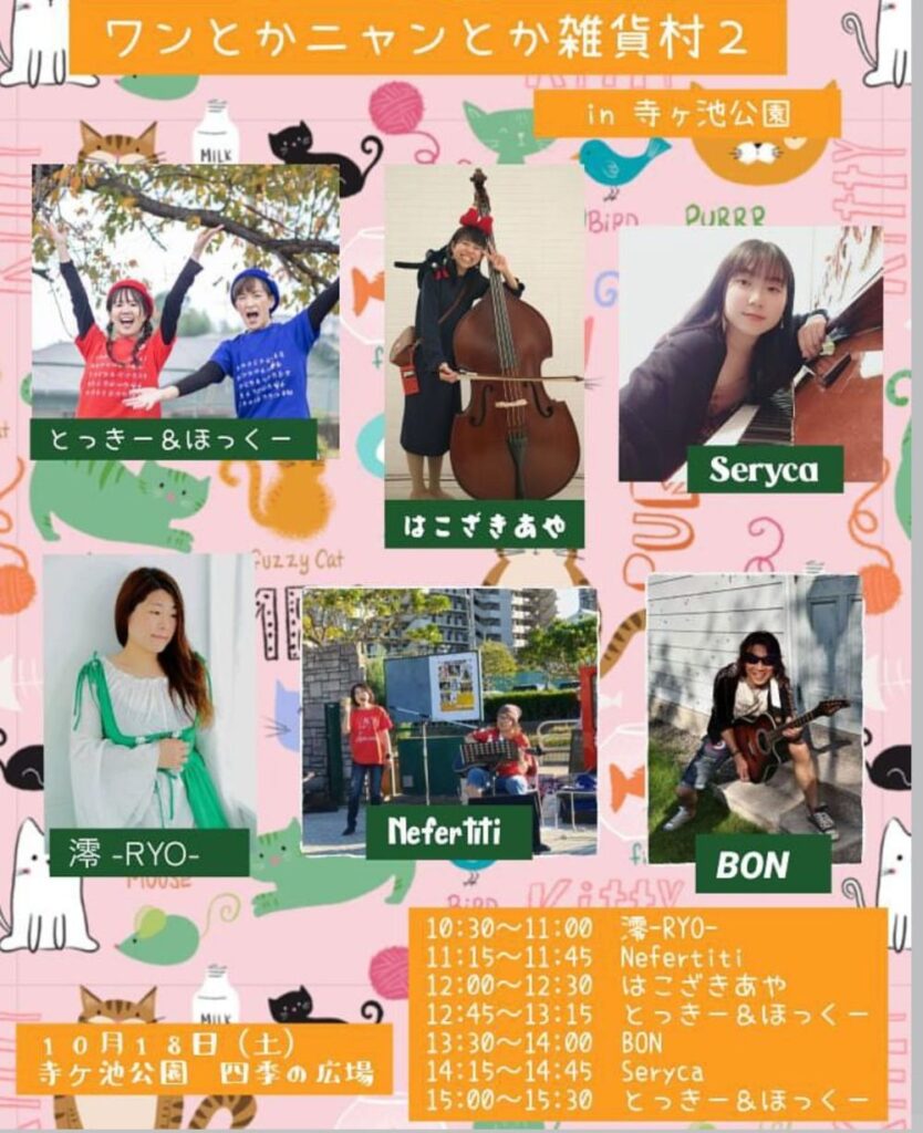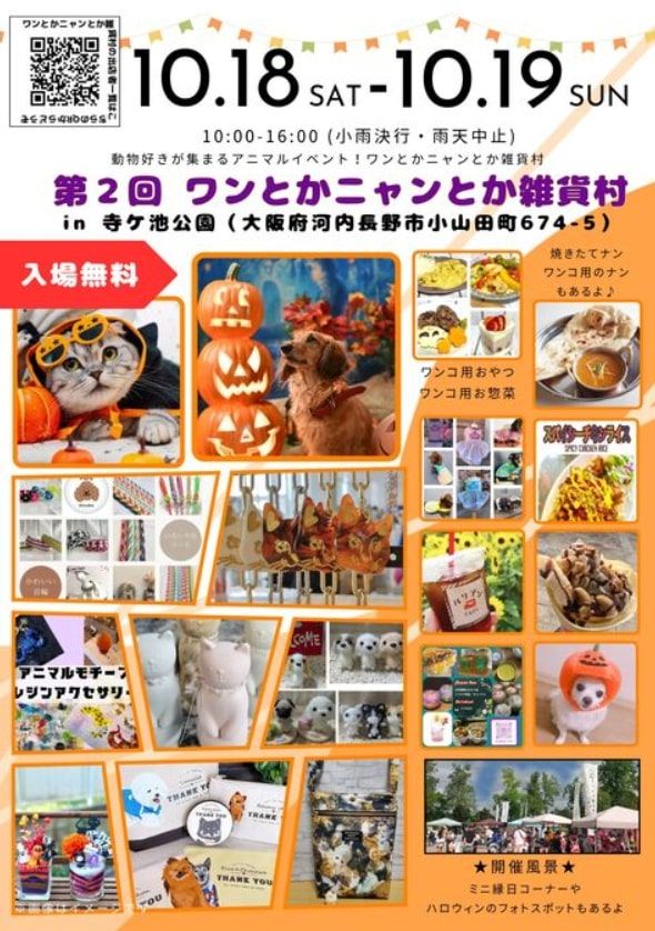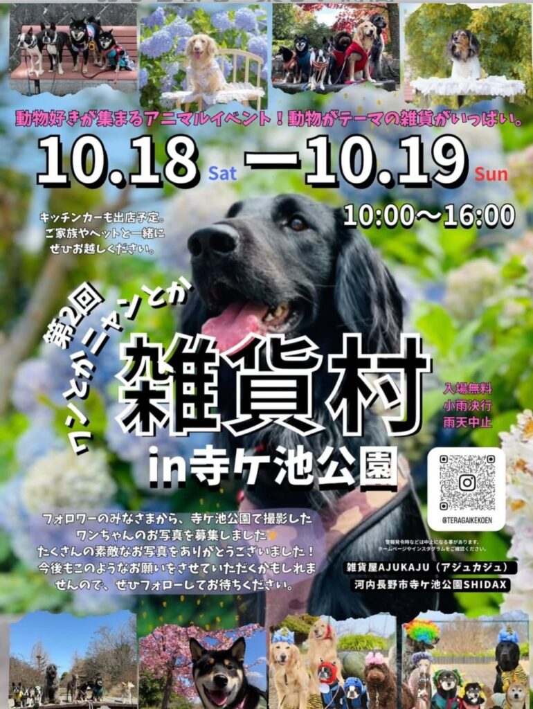 ワンとかニャンとか雑貨村in寺ケ池公園は、寺ヶ池公園に散歩に来るワンと飼い主が一緒に楽しめて交流できることを目的に行われるイベントです。10月18、19日の2日間、10:00〜16:00の予定で行われます。