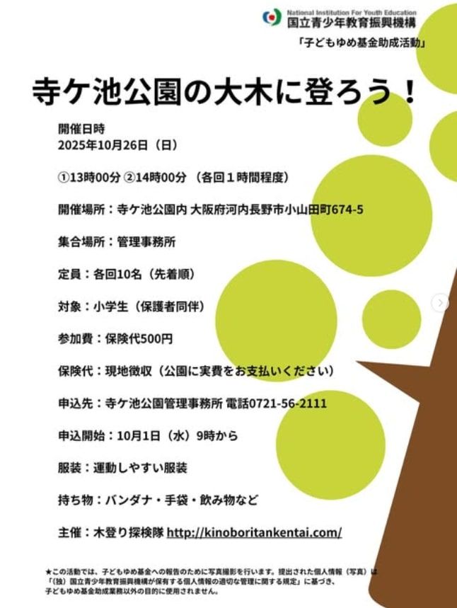 また同じ日に寺ヶ池公園の大木に登るイベントがあります。保護者同伴の小学生が対象で13時と14時の二回行われます。運動しやすい服装で、バンダナ、手袋、飲み物などを持参ください。こちらは10月1日から申し込みが始まっているので、興味ある方はお急ぎください。