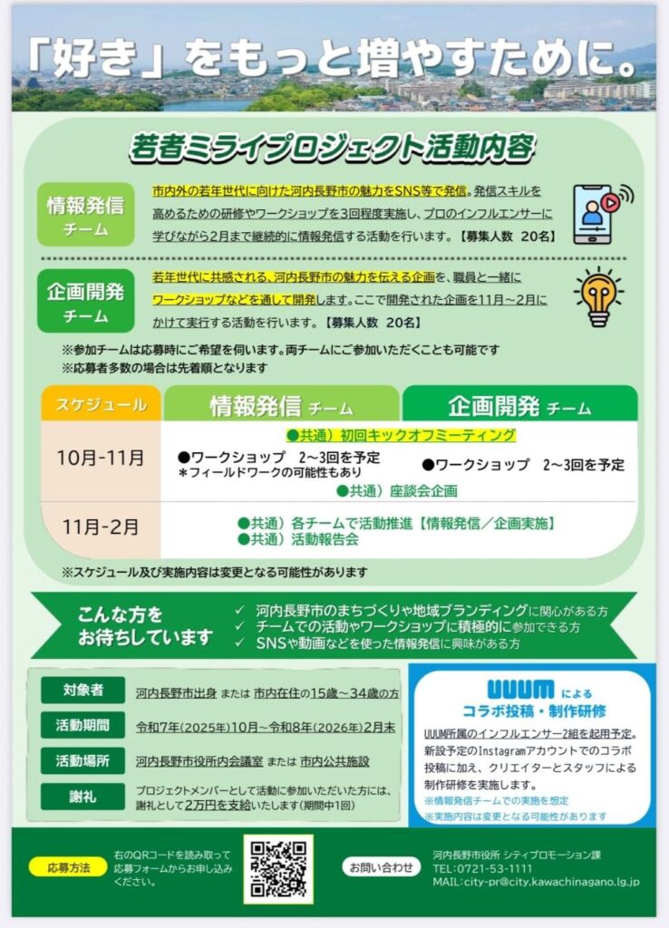 若者ミライプロジェクトのは市内外の若年世代に向けた河内長野市の魅力をSNSで発信する「情報発信チーム」と、若年世代に共感される河内長野市の魅力を伝える企画を職員と一緒に開発する「企画開発チーム」があり、募集人員は20名で両方の参加も可能です。予定では10月から11月までワークショップを2、3回行った後11月から2月まで活動推進と活動報告会を行う予定です。さらにプロジェクトメンバーとして参加した方には2万円の謝礼の支給が1回行われるとのこと。