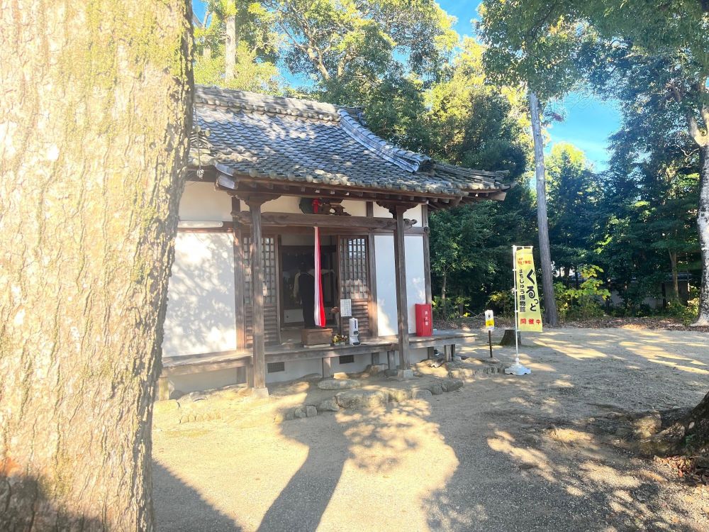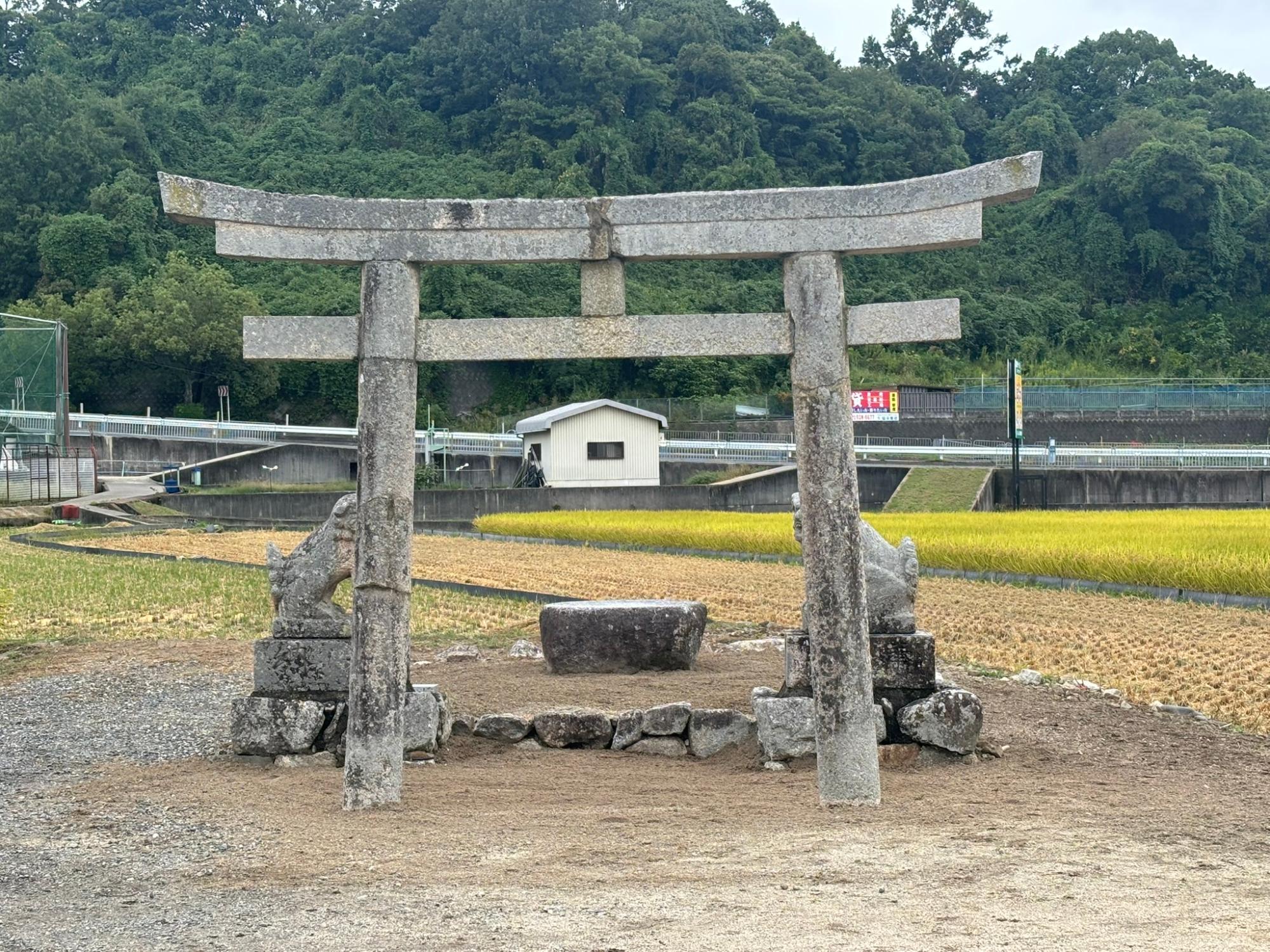 そしてこちらが普段の御旅所です。Googleマップでは「鳥居と狛犬」として紹介されています。鳥居の後ろに狛犬が鎮座しその後ろが一段高くなっていますが、秋祭り当日は、ここに神輿に乗せられた高向神社の御霊が鎮座します。