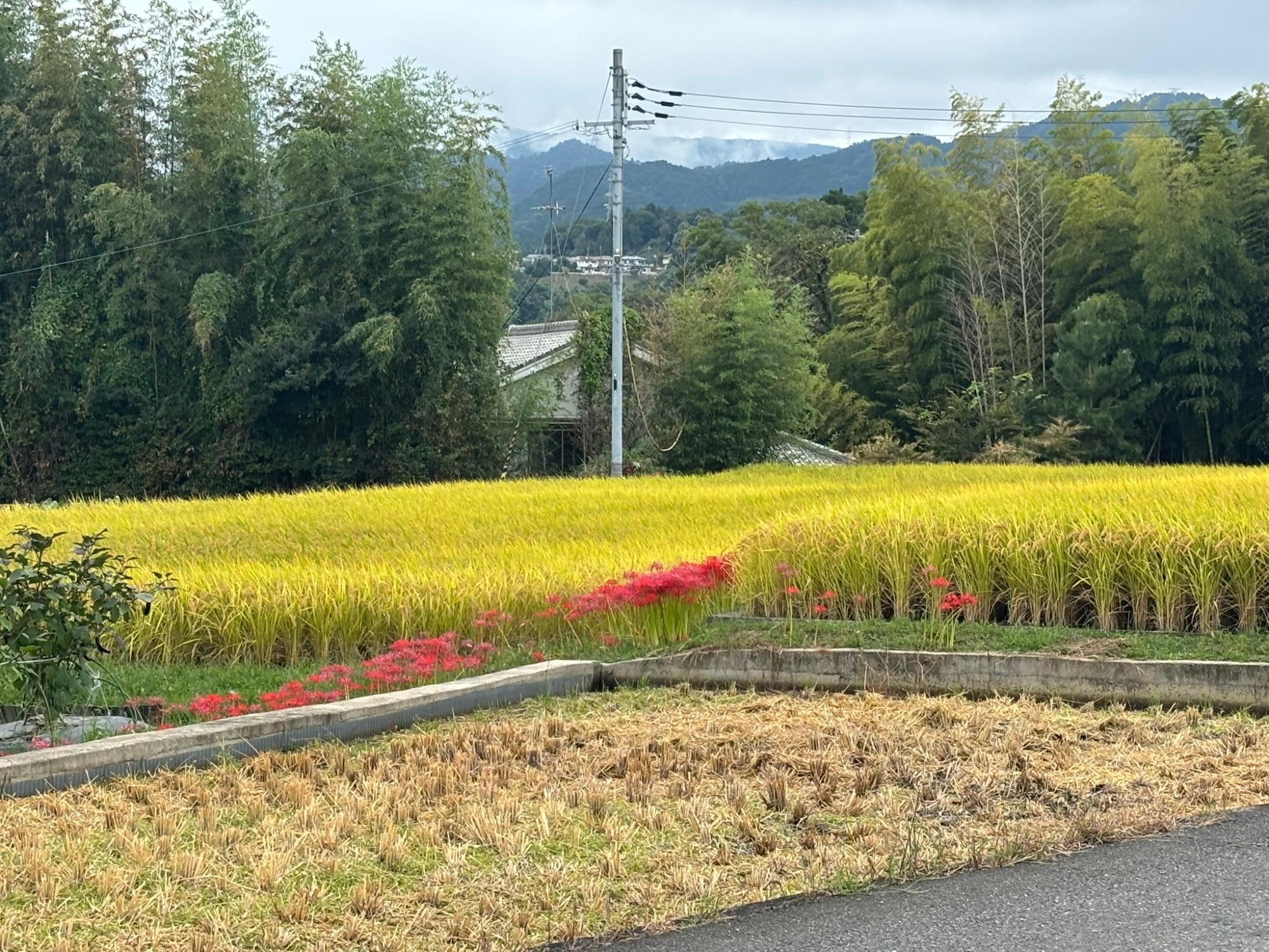 ここだけ時系列がつい最近になります。数日前に普段の御旅所の様子が気になり訪問しました。品種によってはすでに稲刈りが終わっている田んぼもありますが、その多くはまだ稲刈り前で、今年も黄金の稲穂が垂れその周りで彼岸花が赤い花を咲かせています。