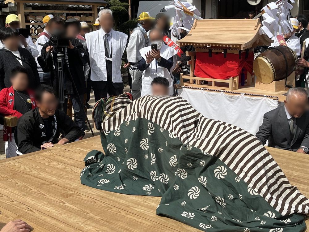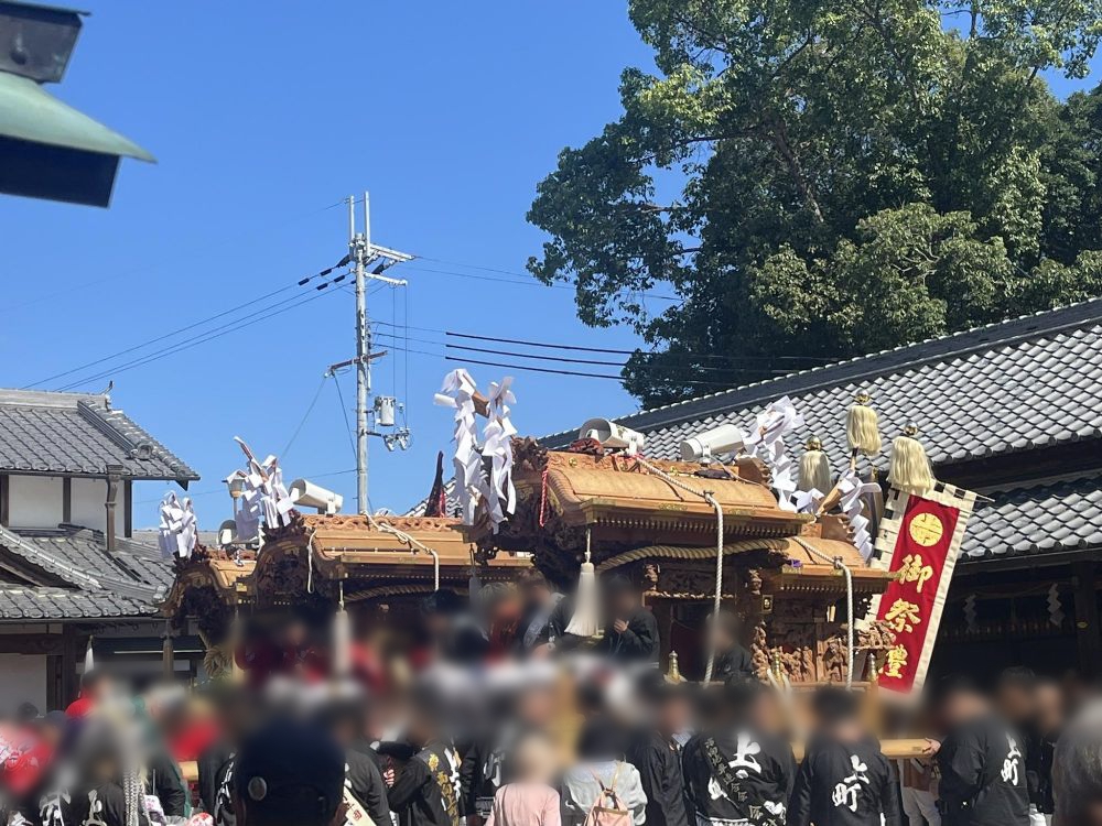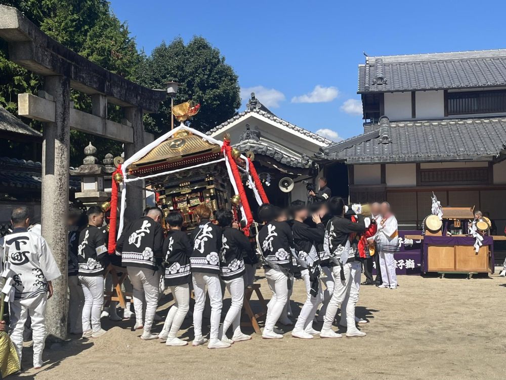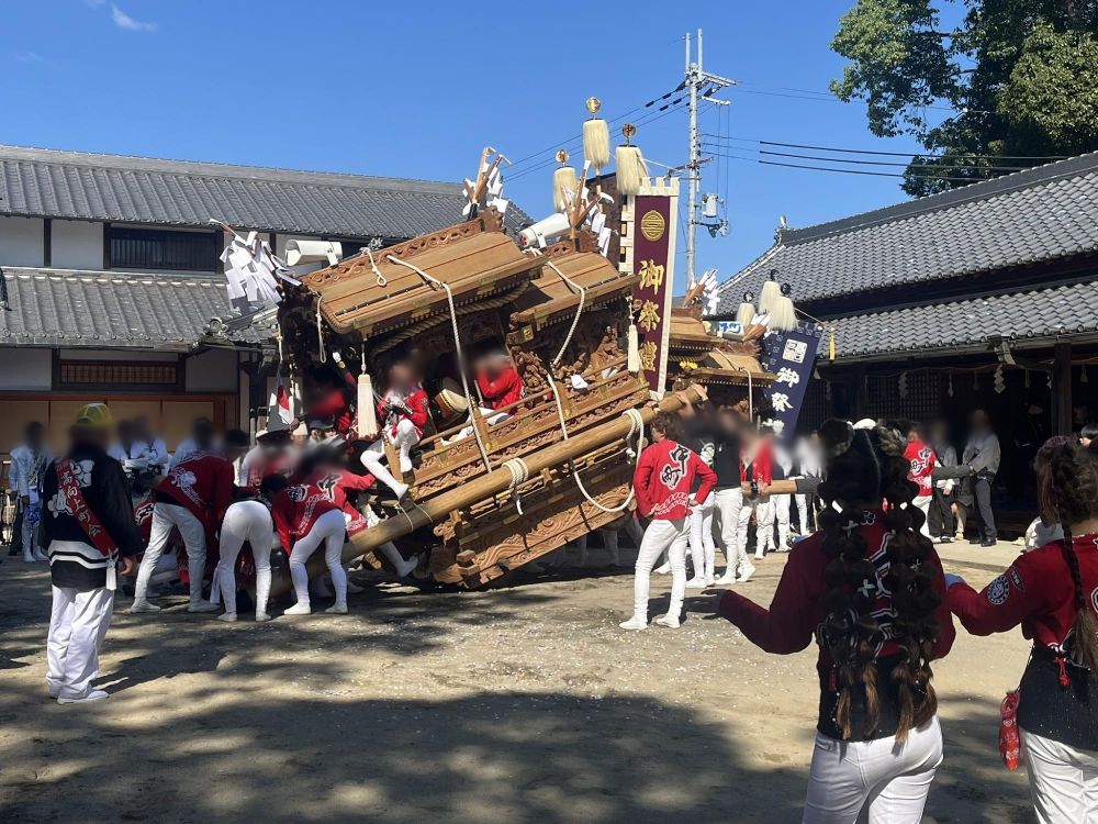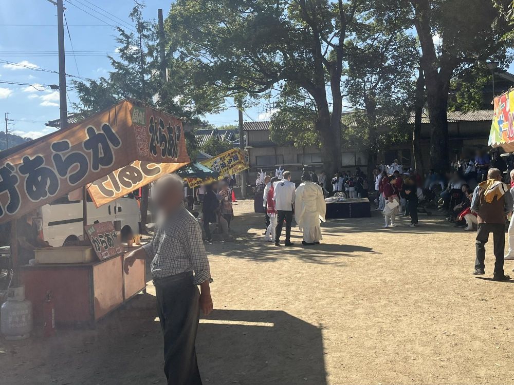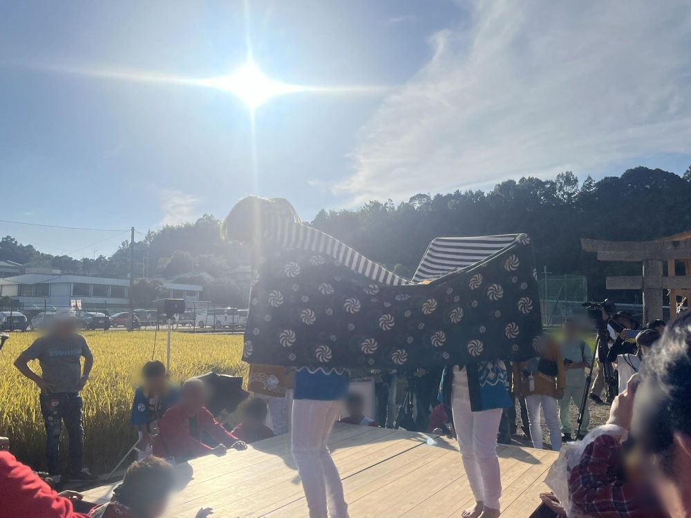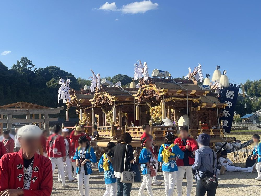 普段の御旅所は鳥居の前が本当に広い空き地のようになっていますが、秋祭りになると3台の地車が到着し、獅子舞のための舞台が設置され、高向3町(下町、中町、上町)と日野地区関係者の人たちが集結します。