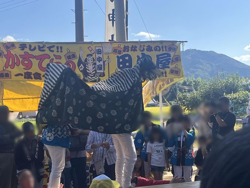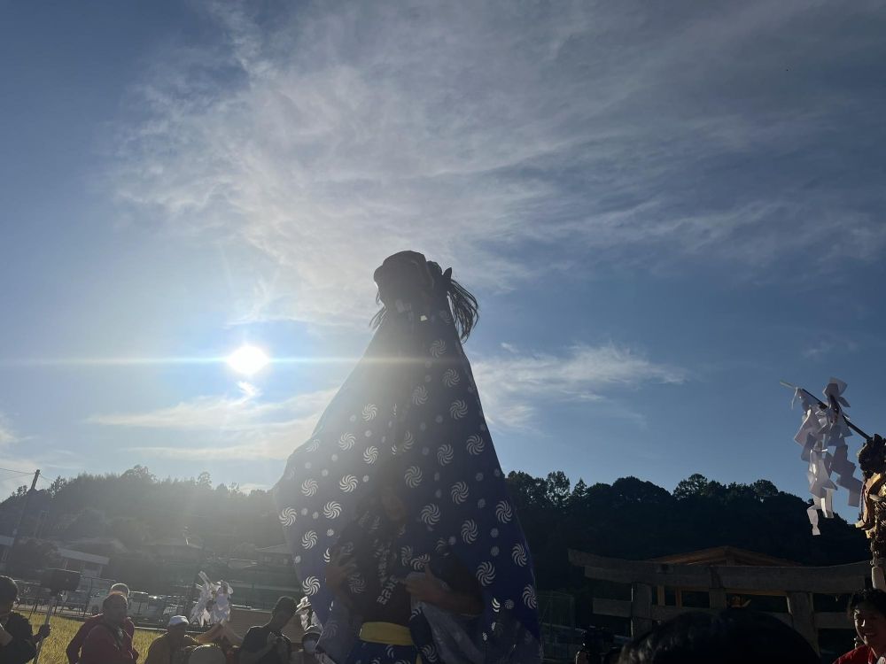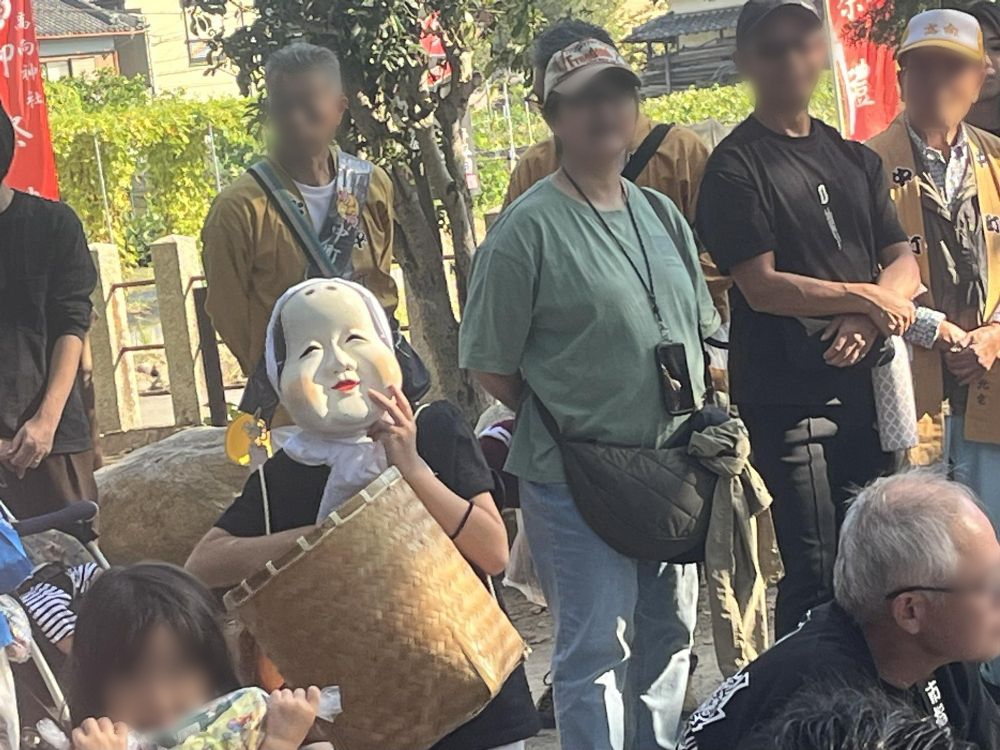 次は「地巣籠の舞(じすごもりのまい)」です。子孫繁栄を願った舞いです。そして獅子舞とは別に忘れてはいけない存在が登場します。