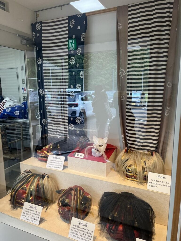 日野獅子舞はもともと日野地区で行われていた伝統行事。もともとこの地に鎮座していた春日神社で奉納されていたものです。日野のみのでホールに行くと、「ししまい館」というのがあり、入口で獅子舞の頭が展示してあります。