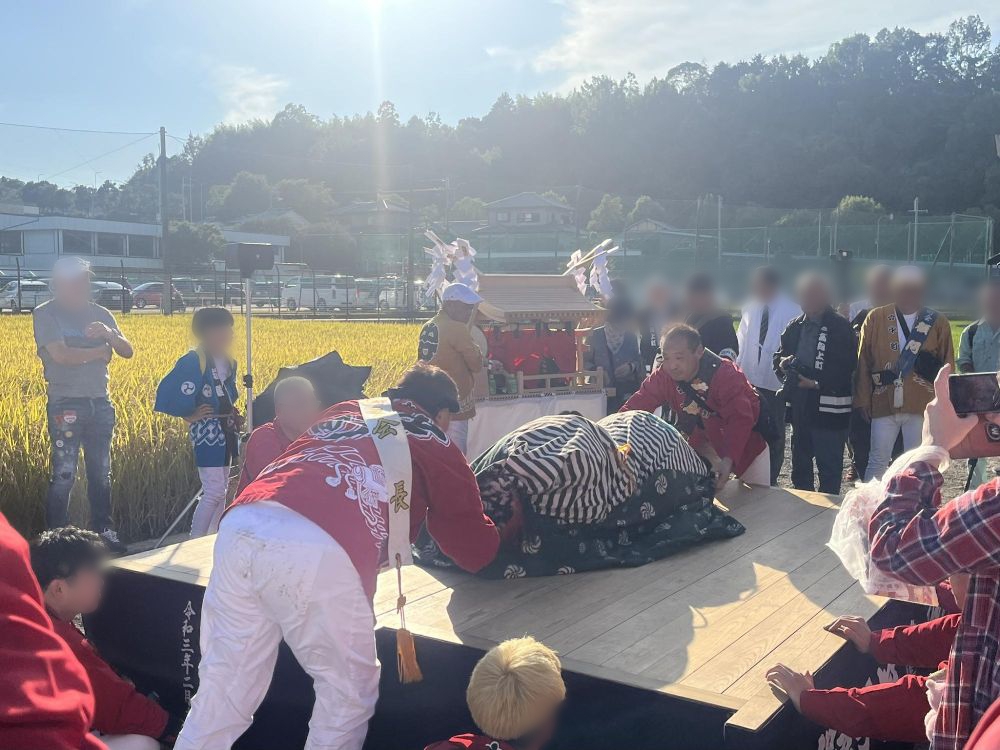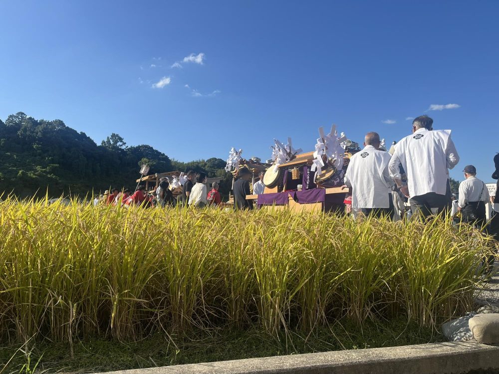 そして神輿が来ました。いなほが首を垂れる中、神社に鎮座する神様が乗った神輿が御旅所に到着します。
