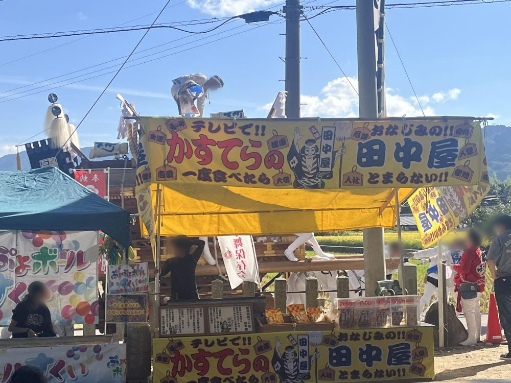 薬師堂の前に的屋さんの屋台があり、その後ろを地車が通過していきます。