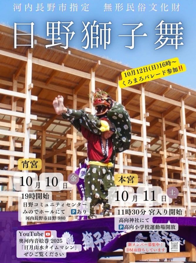 【河内長野市】万博で大好評の奥河内音絵巻に登場!日野獅子舞鑑賞お勧めは神輿地車も出る11日高向神社