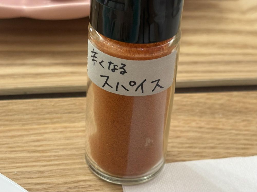 ということで、まずは堤部分を崩さずにカレーのルーをいただいたのですが、最初はあまり辛くない印象で、「お子さんでも気軽に食べられるようになっている」とみました。しかし、こちらの「辛くなるスパイス」を振りかけると、しっかりとした辛さの影響で旨みが強調され、さらに美味しくなりました。
