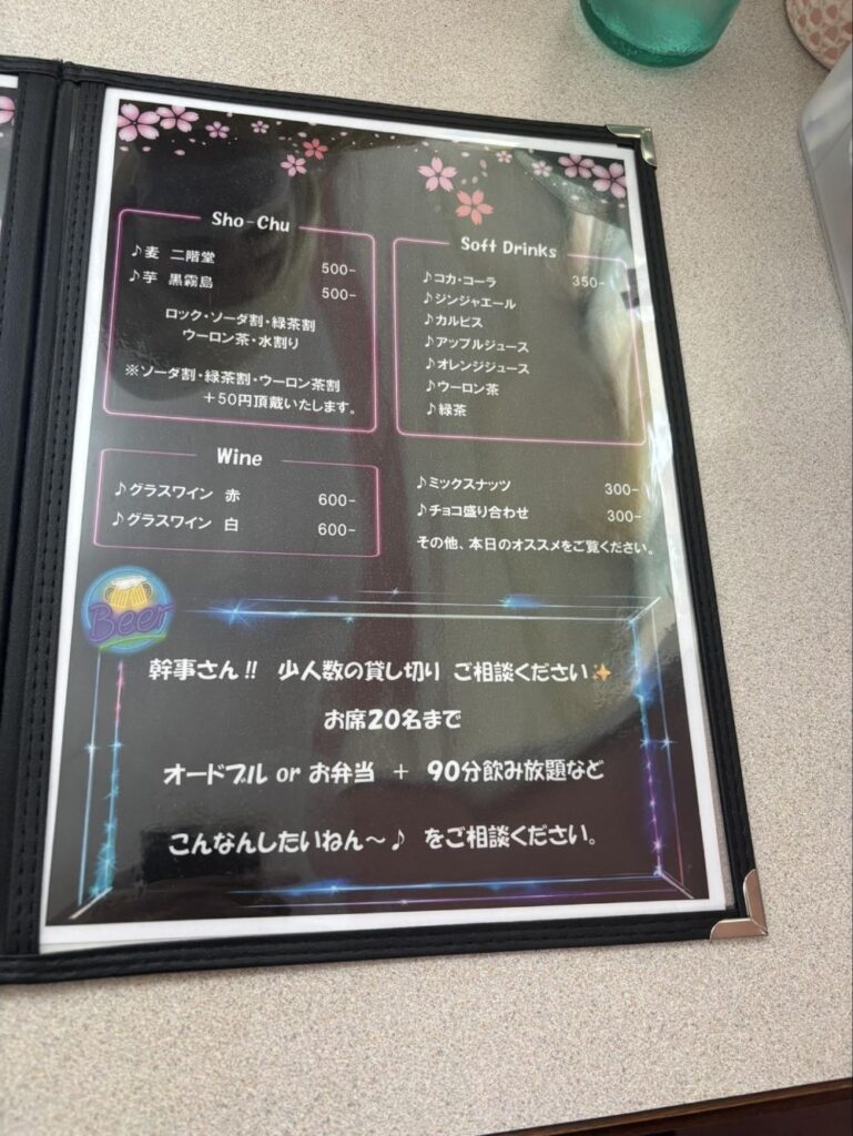 それだけではありません。焼酎、ワイン、ソフトドリンクもあります。そして20名までの団体予約にも対応しているとのこと。