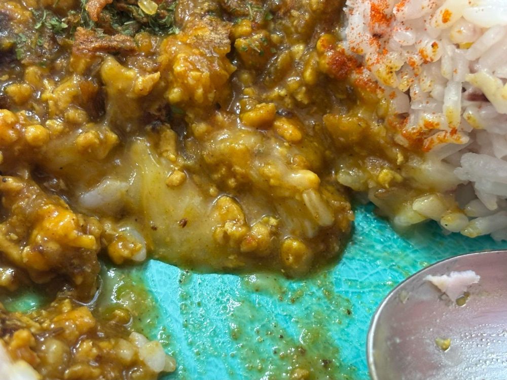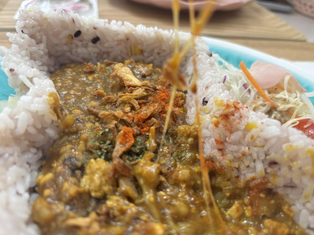 そして驚いたのはこちらです。突然カレーが伸びていますが、これは中にチーズが入っているからです。事前に店の人から「カレーの中にはチーズが入っている」と説明がありました。このチーズがまたカレーとの相性がよく、チーズの「まろやかさ」により、一層美味しさが増している気がしました。