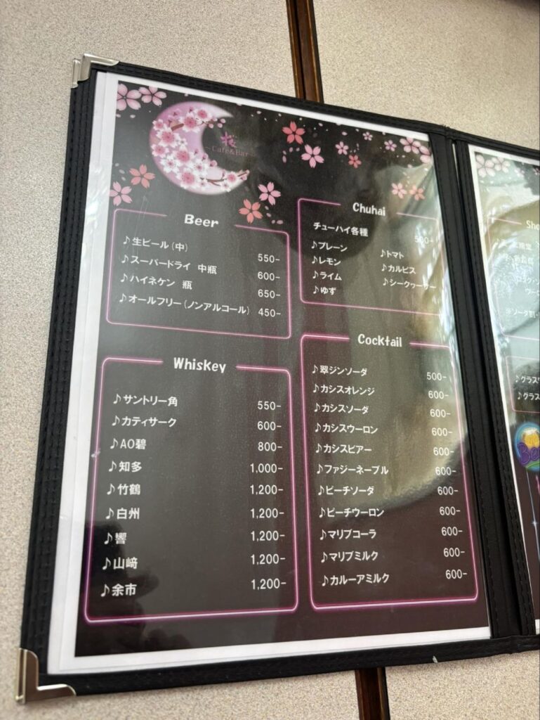 こちらは夜のバータイムのメニューです。ビール、チューハイ、カクテル、ウイスキーと揃っています。夜営業についてお話を伺うと「今年も暑かったので『まずは生ビール!』というお客様や、贅沢なウイスキーを飲みに来てくださる方。女性陣はカクテルとクレープやソフトクリームを楽しまれたりします」ということで、夜も人気のお店なんだなと感じました。