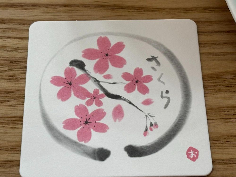 そしてティーソーダーを支えていたコースターにも思わず見とれてしまいました。桜の花と「さくら」と書いてあるアート作品です。