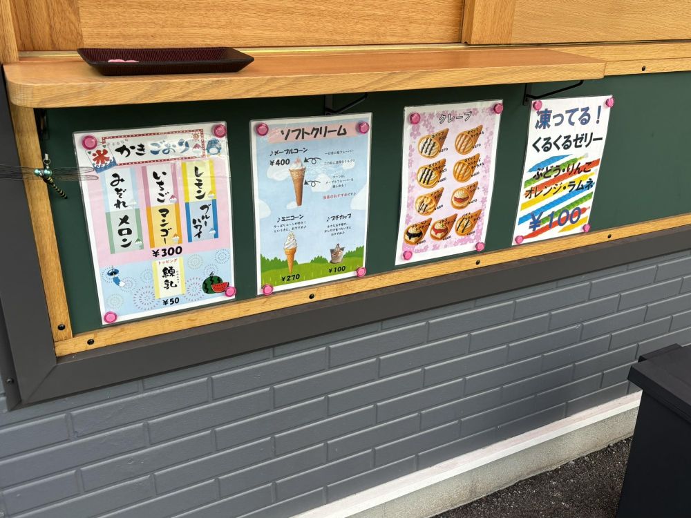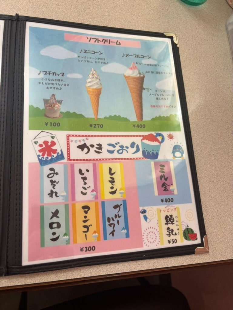 ソフトクリームやかき氷のメニューです。ソフトクリームはブチカップからメープルコーンまで3種類から選べます。