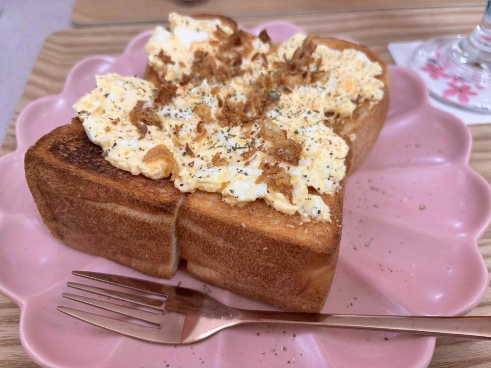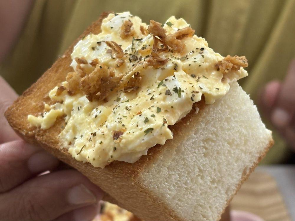 上に載っているのは卵サンドの中身で、刻んだゆで卵にマヨネーズを混ぜているものです。その上にガーリックとコショウが振りかけられていました。