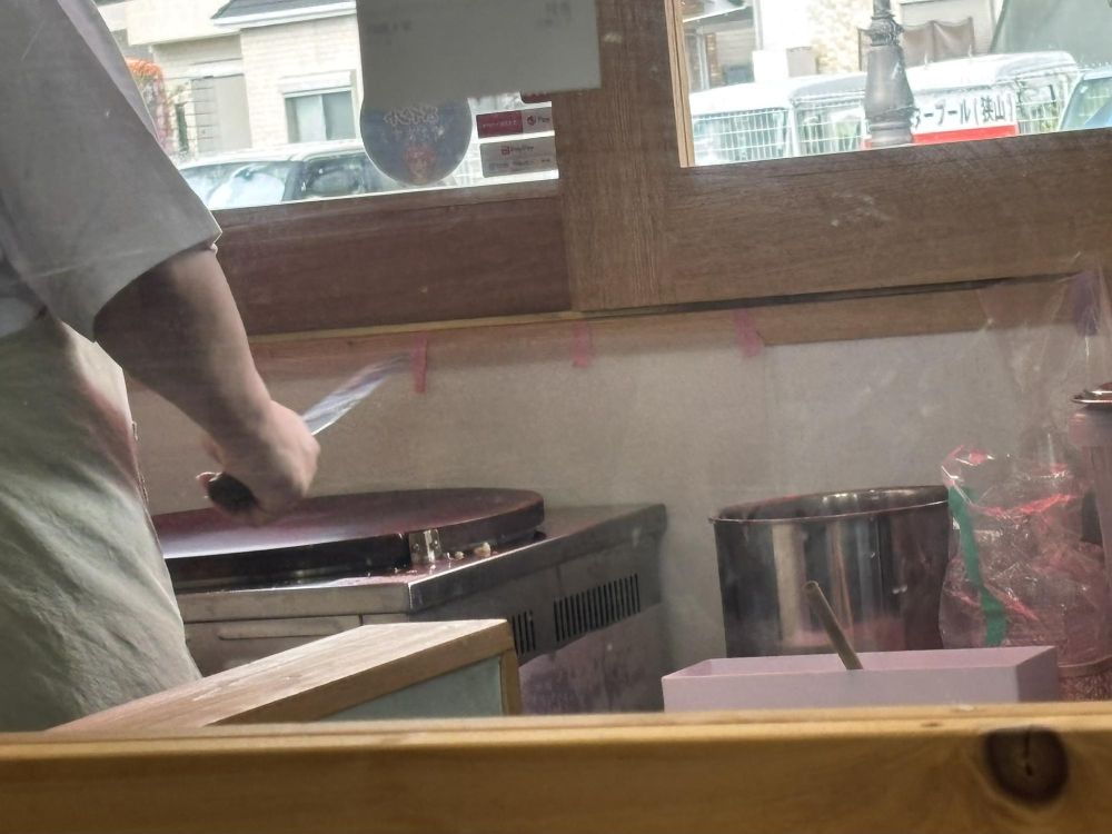 これは店の外からの画像ですが、ドアの左はこのようになっていて、その場でクレープを焼いている様子が見られ、ここで手渡されます。