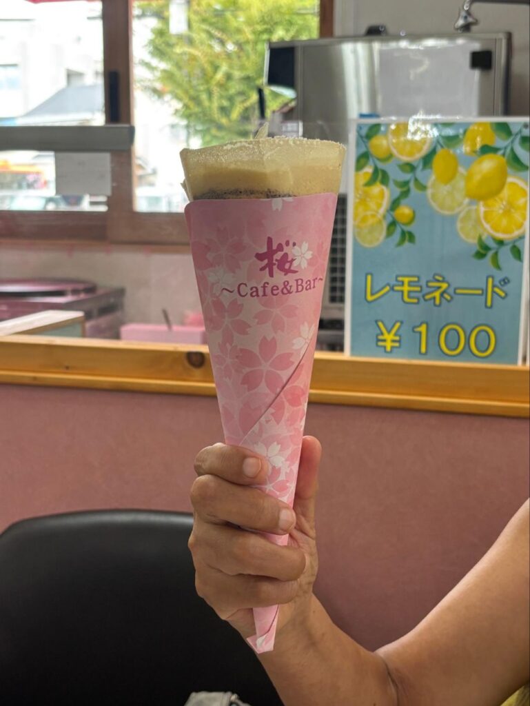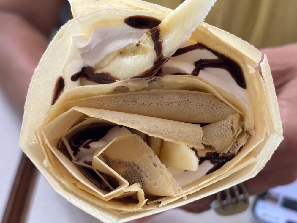 立てにするとこのようになっています。結構ボリュームがあり、おやつとしても最適です。AIによればチョコの苦み成分をバナナの甘みで引き立てる効果があるそうです。実際に食べた印象としては両方のうまみとクレープの皮と見事に調和がとれていて、食事を終えた後なのに気にせずいただけました。そういえばお祭りの時などで出店する的屋さんのメニューにもありますね。