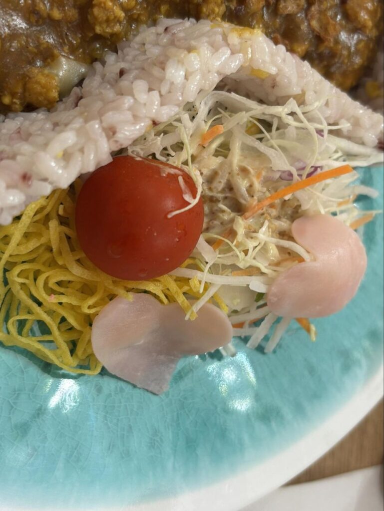 そして、おそらくさやか公園付近に該当するところにある添え物です。桜の花びらをイメージしたものやプチトマト、錦糸卵など、ドレッシングがかけられたサラダです。これだけいろいろあると、かつてのさやま遊園を思い出すのは私だけでしょうか?