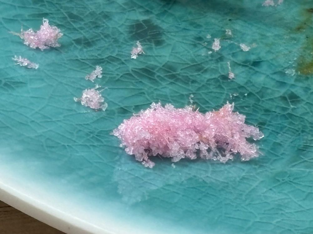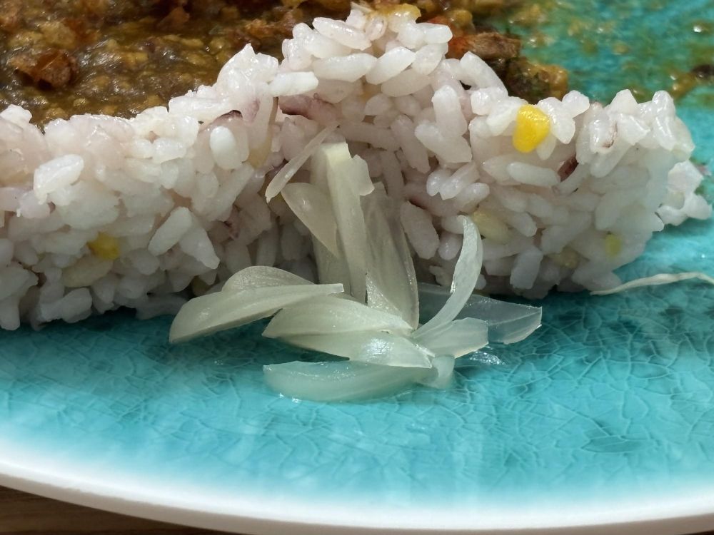 反対側です。らっきょうを刻んだものが並んでいます。このあたりは池からの水が西除川に流れ出すあたりの堰をイメージしているのでしょうか?このあと水の流れは大和川を経由し、最終的に大きな海に注ぎ込む。出発点ですね。