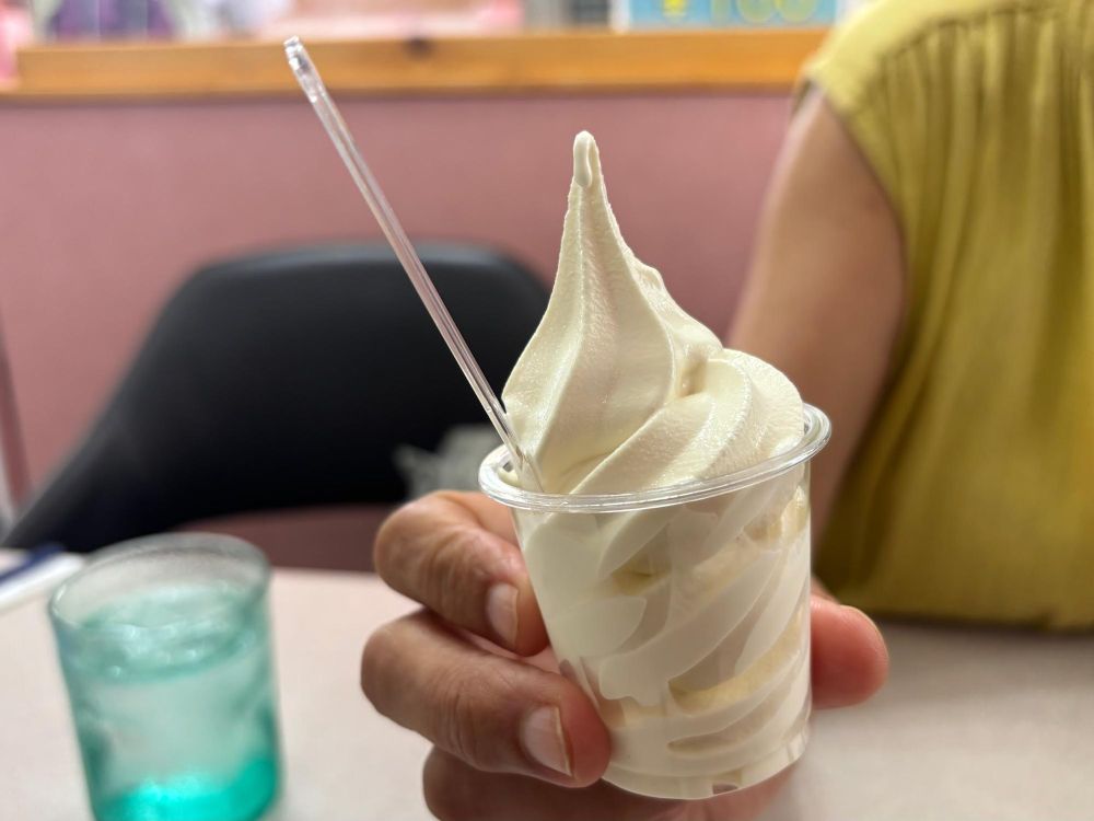 さて、こちらはダムカレーについていたプチカップのソフトクリームです。口の中を「スキット」させてくれる効果があります。それにしても結構頂いておなかが膨れましたが、やはりデザートは別腹ですね。
